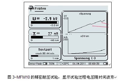MFM10耐壓試驗(yàn)過(guò)程顯示電壓隨時(shí)間的變化曲線(xiàn),通過(guò)陡坡突跳,方便辨認(rèn)被測(cè)電纜外護(hù)套故障點(diǎn)數(shù)量。
