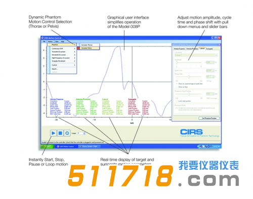 使用CIRS運動控制軟件獨立控制前列腺運動。圖形用戶界面提供無限種類的優化運動配置文件,同時將Dynamic Pelvis Phantom的操作簡化到直觀的水平。
